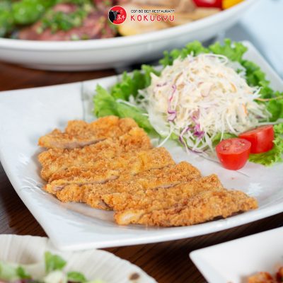 Tại KOKUGYU, Tonkatsu sự kết hợp của hương vị thơm ngon của thịt lợn và nước sốt đặc chế. Được chế biến từ thịt heo hảo hạng ướp với chút gia vị và rắc thêm một lớp bột mì. Tiếp đó, thịt sẽ được nhúng vào trứng rồi tẩm với bột chiên giòn và được chiên ở nhiệt độ thấp. Lớp bột chiên xù vàng ruộm giòn tan bên ngoài. Lõi thịt vẫn giữ được độ mềm và mọng nước.