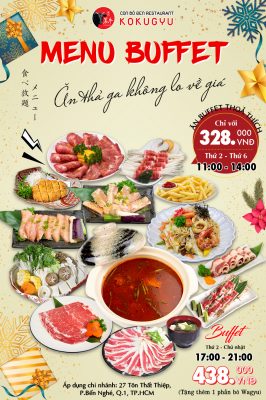 Chỉ với 328.000vnđ/1 người được ăn thoả thích không giới hạn đã vậy còn được tặng ngay 1 phần bò Wagyu cho vé buffet tối.